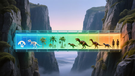 Dinosaurs and human silhouettes coexist in a vibrant digital canyon vision.