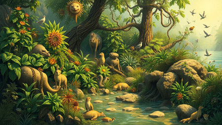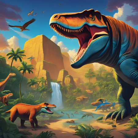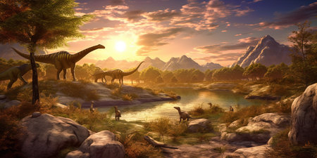 A detailed illustration depicts various dinosaurs in a vibrant prehistoric environment. Large trees and foliage surround the creatures, with sunlight filtering through the canopy. The composition features diverse dinosaur species, suggesting a thriving ecosystem. This image is suitable for educational materials, historical representations, and imaginative commercial projects.