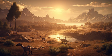 View with dinosaurs in ancient environment. Ancient creatures in natural habitats. Prehistoric natural landscape with dinosaurs