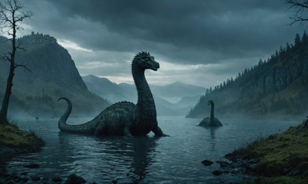 A mythical creature emerges from the depths of a misty lake, its long neck reaching towards the cloudy sky