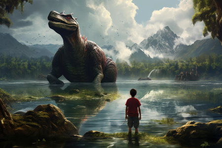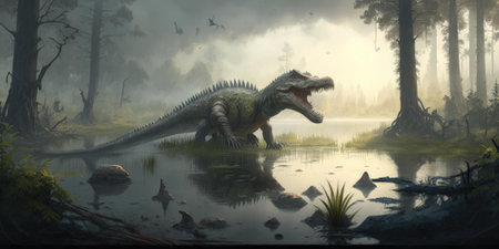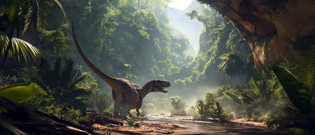 A stunning depiction of a dinosaur in a misty jungle setting, surrounded by lush flora and tranquil waters. This serene scene captures the essence of ancient life on Earth.