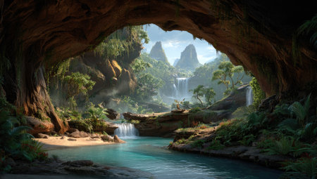 Lush tropical landscape, view from a cave, waterfalls, river, mountains, and vibrant foliage