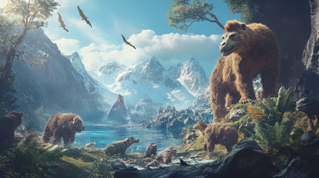 Fantasy landscape with animals. 3D render of wild animals in the lake.