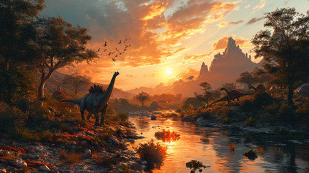 A group of dinosaurs gathers near a river during a vibrant sunset. The scene captures the silhouettes of the creatures against a stunning orange sky, creating an iconic prehistoric atmosphere.