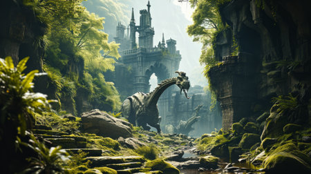 Fantasy landscape with a castle and a dinosaur statue in the jungle. 3d rendering.