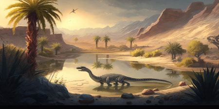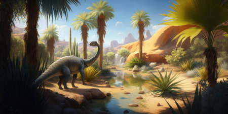 Primeval paradise of the Cretaceous period with animals and plants