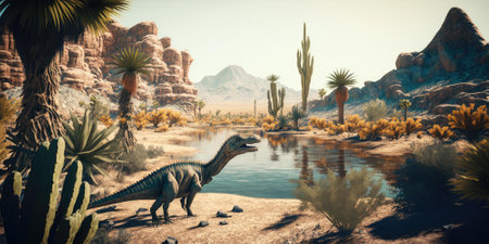 Dinosaur in the desert. 3D render. Fantasy landscape.