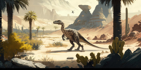View of Velociraptor dinosaurs in an ancient environment. Ancient creatures in their natural habitat. Prehistoric natural landscape with dinosaurs