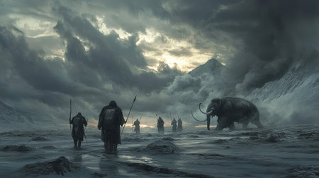 A group of hunters armed with spears approaches a massive mammoth in an icy tundra. The dramatic clouds enhance the tension of this prehistoric moment, capturing an ancient struggle for survival.