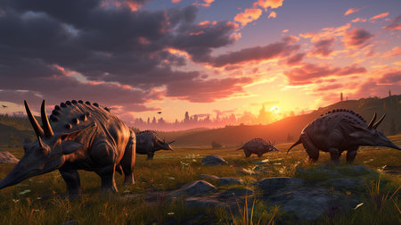 dinosaur on the meadow at sunset - 3d render illustration