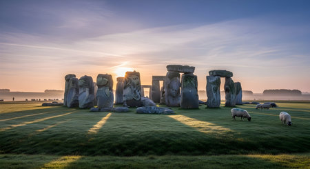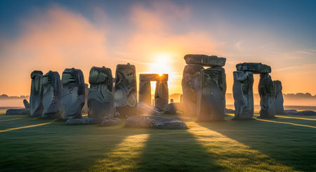 Captivating image of the iconic Stonehenge at sunrise, surrounded by a serene landscape. The soft fog enhances the ancient atmosphere, evoking history.