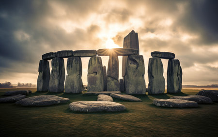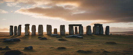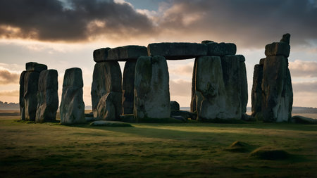 Experience the awe-inspiring mystery and spiritual significance of Stonehenge set against the dramatic UK landscape Golden hour or stormy skies enhance the mystical atmosphere highlighting the ancient stone circles and vast surrounding landscape