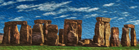 Standing stones arranged in a circle shape forming the Stonehenge monument, a man-made complex dating from Neolithic and Bronze Age in southern England. Oil paint filter.