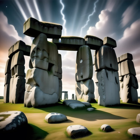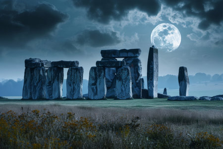 Mysterious stone circle under stormy sky conveys ancient rituals