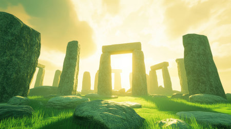A breathtaking view of an ancient stone circle bathed in warm evening light, surrounded by lush grass and dramatic clouds, evoking mystery and history.
