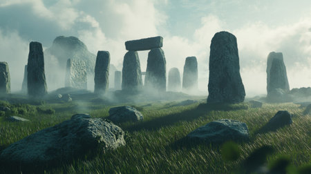 Ancient stones create a structure in open land surrounded by fog, highlighting their historical significance and mysterious atmosphere.