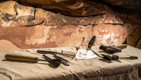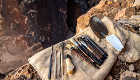 A set of specialized archaeological tools rests beside ancient petroglyphs carved into a sunlit rock face. This scene captures the moment of discovery and the careful process of uncovering and studying the history of early human civilizations.