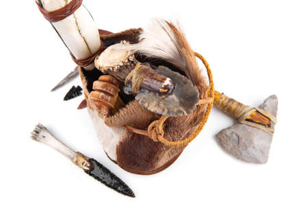 Stone Age Handbag with Cavemen Ax, Tools and Knife on white background