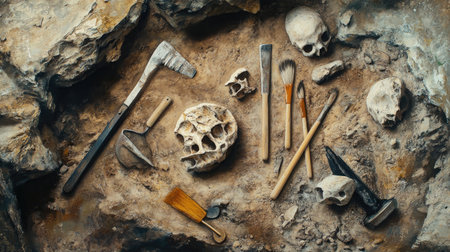 A detailed view of archaeological tools and skulls on a dig site, showcasing the intricate process of excavation and discovery in anthropology.