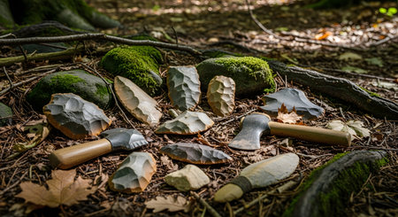 ancient stone tools displayed on natural surface, created with generative ai