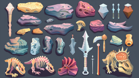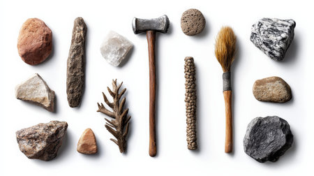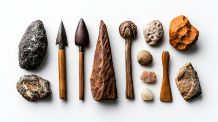 A collection of ancient tools and artifacts are laid out on a white background. The objects include a spear, a stone tool, and a piece of wood. Concept of history and the passage of time