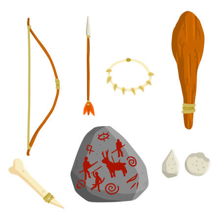 Set of stone age man. Caveman weapons for hunting and life. Wooden club, bow, arrow, bone. Prehistoric set of a wild tribe. Cartoon flat illustration