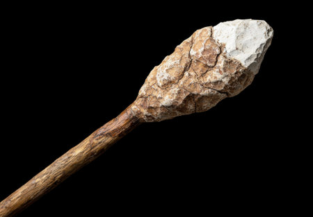 A close-up view reveals the intricate craftsmanship of a primitive stone arrowhead, meticulously fastened to a wooden shaft with natural resin and cordage.