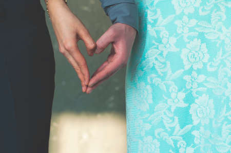 Hands of two lovers in shape of love heart. Valentine's Day or wedding ceremony photos concept. Closeup of couple making heart shape with hands