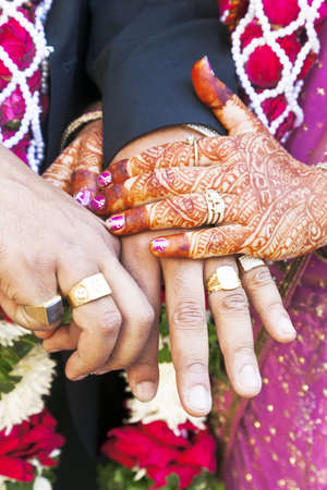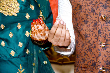 Vertical color portrait taken at a hindu wedding in Surat India Photo session after the cerempny of the happy hand holding couple displaying their rings of matrimony and the brid lays her claim