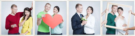 Photos of young loving happy couple through their life from first date to first pregnancy