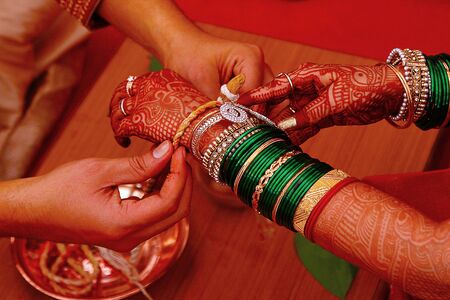 Horizontal color capture hindu wedding Part of the ceremony is that the mother in law supports the hand of her daughter who in turn supports the grooms hand whilst the rituals are being performed by clergy