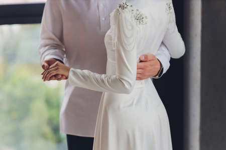 Young adult male groom and female bride holding hands together,Hands of newlywed couple.
