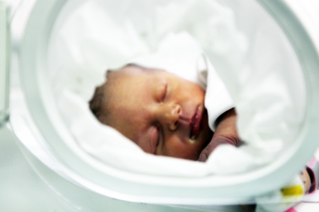 Newborn neonatal infant pulse oximeter premature baby. Children inside incubator.