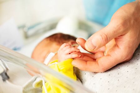 A father wearing a grey shirt and wedding ring gently touches the small hand of his newborn infant lying in a hospital bed with medical equipment visible in the background.