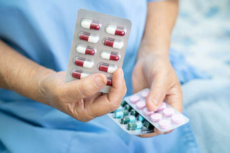 Asian senior or elderly old lady woman patient holding antibiotics capsule pills in blister packaging for treatment infection patient in hospital, Pharmacy drugstore concept. Pharmacy drugstore concept.