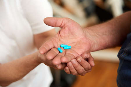 The old female and male hands with pills. Close up senior caucasian woman giving blue pills to senior man. Health care of older people.