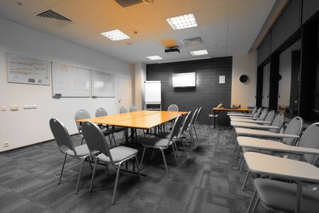 Meeting room interior with table, raw of chairs and block-notes,decorated in black and white tones