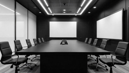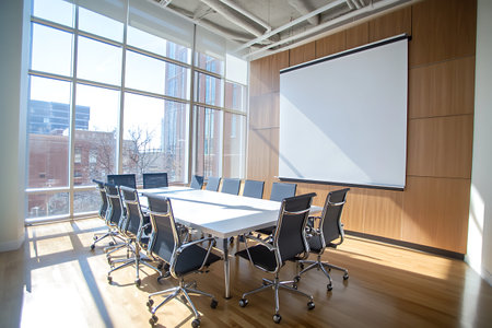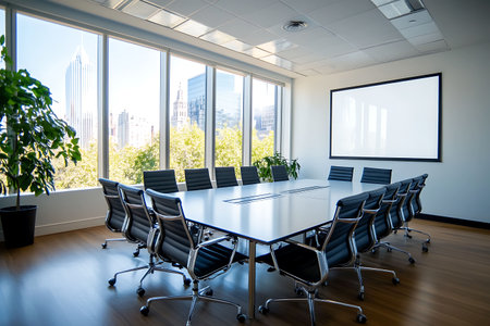 Modern conference room interior with long table and screen