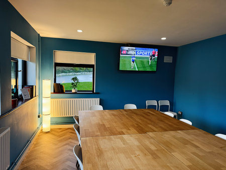 Knock, Ireland - October 22, 2025: Modern conference room in Knock Ireland with a large wooden table, blue walls, and a mounted TV.