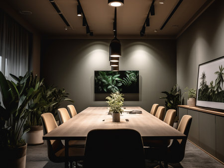 Modern conference room with large table and chairs lit by industrial pendant lights