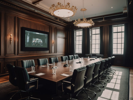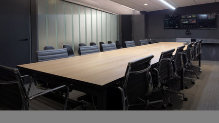 High level meeting of excutive room is decorated with stylish table and chairs around. Conference room is ready for next level of executive meeting.