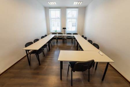 Empty Conference Room In Modern Office. Interior of a classroom with white walls and wooden floor. Office Business. Conference room with benches, tables and a projector.