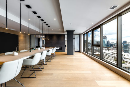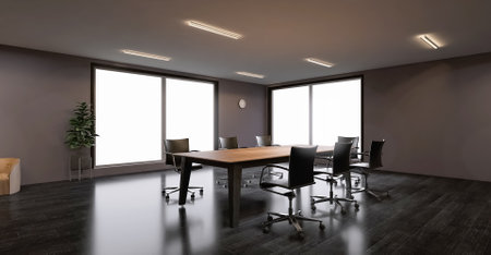 Aestetic indoor business interior office meeting room with table and chairs loock from floor