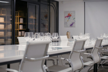 Empty wine glasses on the table, preparation for tasting and staff training. Alcoholic beverage degustation room.