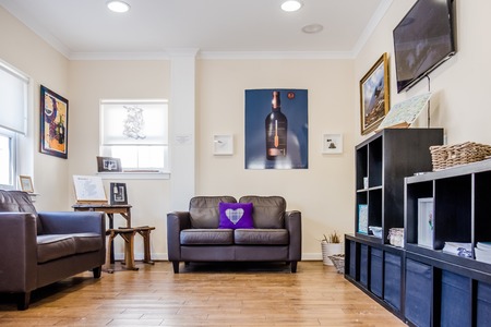 Modern magenta lounge area with snow view window