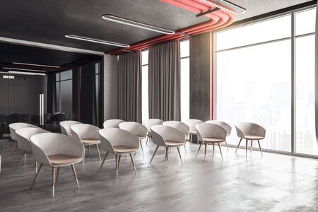 Interior of modern conference room with white walls, concrete floor and rows of black chairs. 3d render