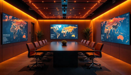 Modern conference room illuminated with global maps display