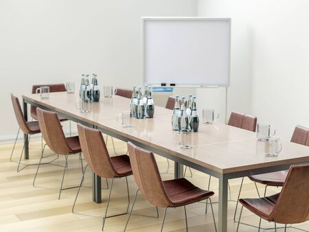 interior of modern conference room with blank whiteboard, nobody inside