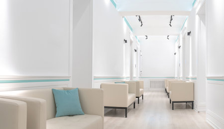 Modern waiting room with beige armchairs, light blue accents, and white walls, clean and minimalistic design, bright lighting, comfortable seating, suitable for medical or professional offices.