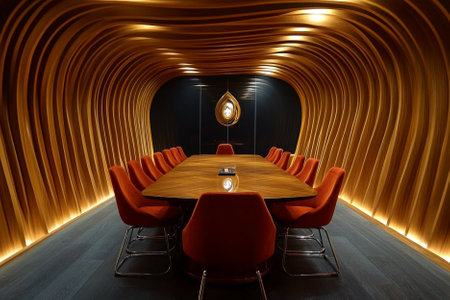 Futuristic corporate meeting room bathed in neon lights